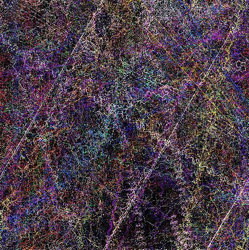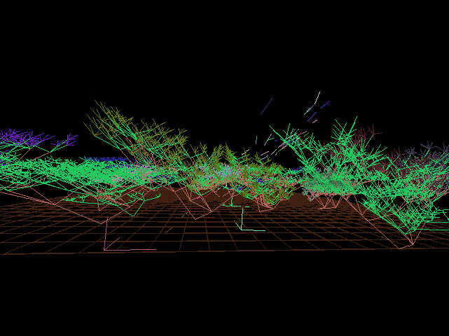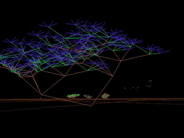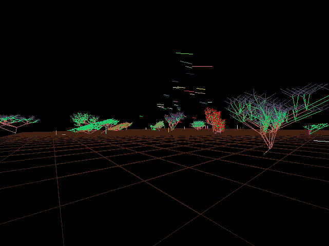 According to Lovell, " EIDEA exists in cyberspace as a mathematical plane floating in a vast space. Three artificial entities exist on this plane; birds, wolves, and trees, and interact to form a closed ecosystem." Trees in this world grow, reach maturity in ten years (y-units), bear fruit and live to an expected 100 years. Birds in this world eat the fruit of the trees, behave in a flocking fashion, breed and create offspring that then join the flock. The predator in this world, a wolf-like creature called a turoid (after computer scientist Allen Turing), feeds on the birds and has its own breeding and life cycle. Lovell explains, "Trees are formed by an L-system, creating a fractal shape. Trees grow slowly, some 100 times slower than the other creatures, and over time bear fruit for the birds and wolves to eat."