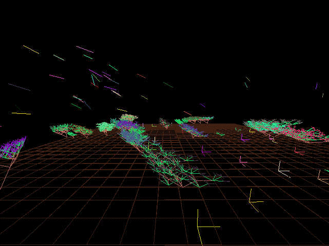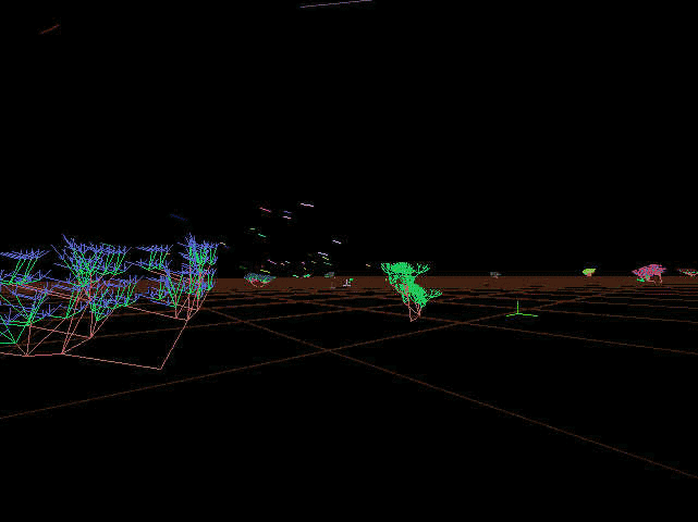 The animals' behavior or movement is modeled to give them unique characteristics. "Animal motions are determined through two types of algorithms; one for bird motions, and one for wolf motion" says Lovell. "Birds behave according to a flocking algorithm [3]. Each bird is bred to avoid predators (wolves), stay within the boundaries of the world, and fly close to the center of the group of birds immediately closest to it."