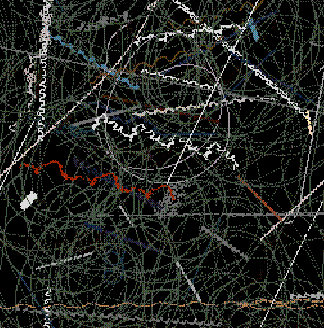 The mural, created as a history of the creatures' movements, is "constructed as a record of the motions of the animals math space. The ground records the passing of animals and then samples a set of images based upon the animals genetic makeup. These colors are then recorded in the mural for display," says Lovell. These images are projected as they manifest becoming a visual aspect of the installation, providing another link between the viewer and cyber reality.