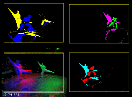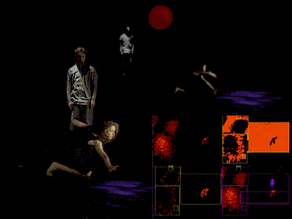 or upstage and downstage depending upon the location of the four dancers. This effect was created using an overhead camera. The contrasting image of the dancers against the floor was used to calculate an average location within an image. This location was translated into a three dimensional stage location through knowledge of the camera geometry. Video on laser disc was manipulated by translating the x and z locations of the dancers into directions of movement within video sequences.