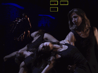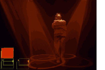 Finally in a fifth section a solo dancer moves about the stage either travelling widely or huddling on the floor. Four robotic lights moved in a circle around her while she performed. When she is on the floor and low, the robotic lights spin slower and closer to her. When she gets up, they move away from her to the outskirts of the stage. This effect was accomplished by placing a camera "looking from" the audience perspective. The height of the contrasting figure in the image determines the speed of the lights and the diameter of the pathway they follow.