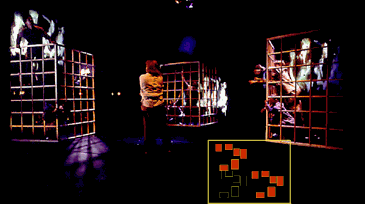 Figure 5. In this section an overhead camera looks at Alison Crawford as she moves between the cages. Her location on stage is calculated and used to manipulate the volume and playback of spoken text.